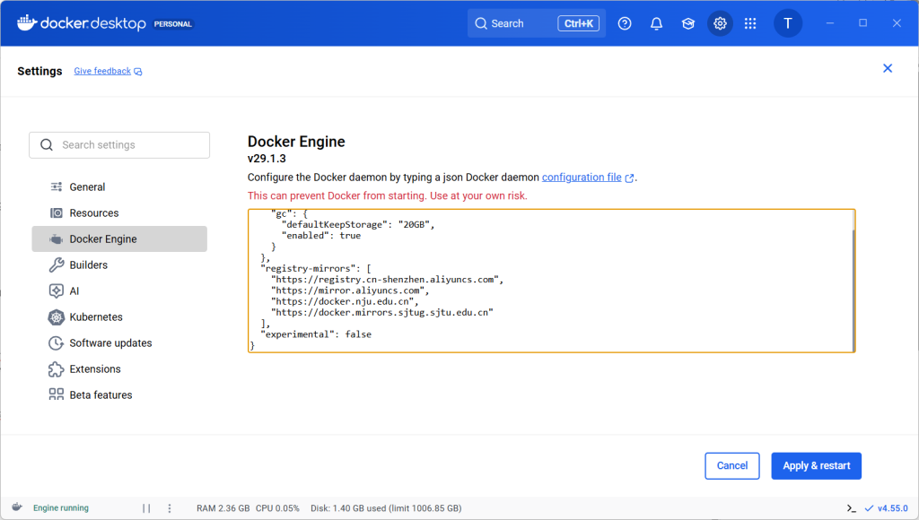点击设置,Docker Engine,在配置中添加